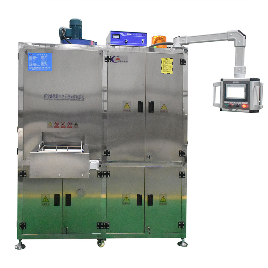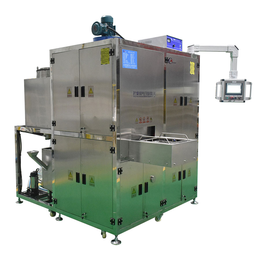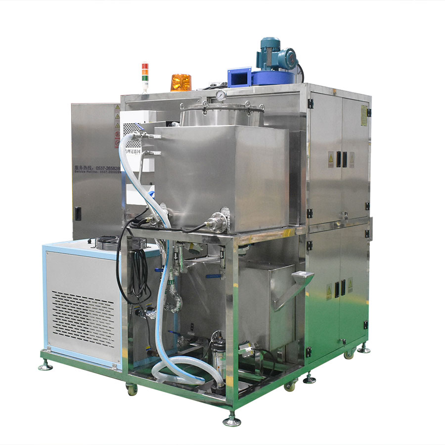 該設備為高潔凈度清洗機,采用碳氫超聲波清洗工藝。該設備由超聲波清洗槽、蒸汽浴洗槽、清洗網框、清洗槽冷凝區、分水器、工業冷水機、溶劑回收機、管路系統、智能控制系統等組成
