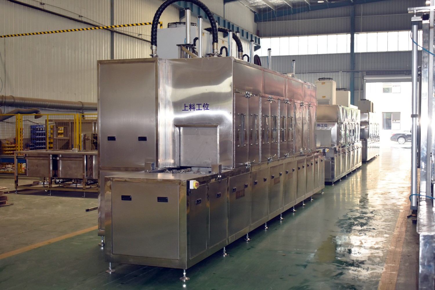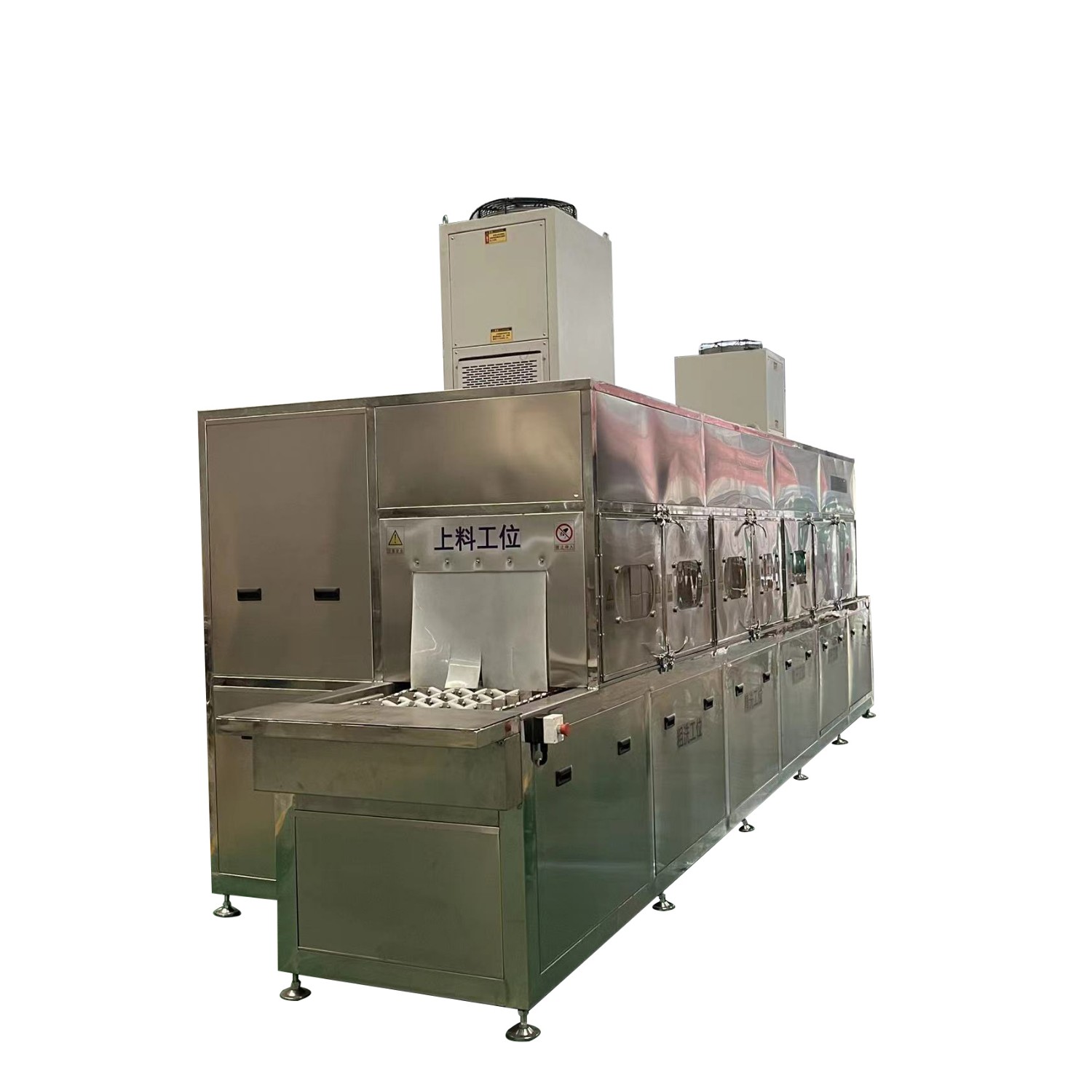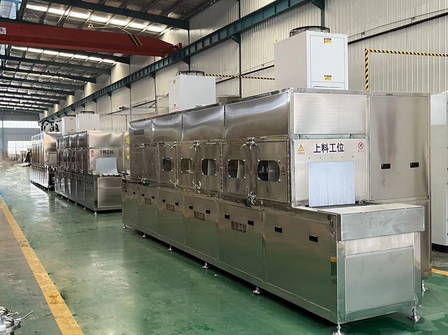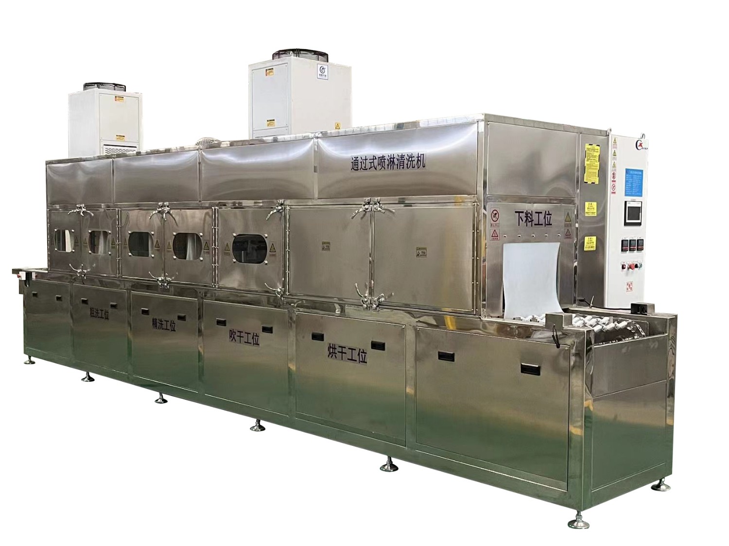 該設(shè)備有上下料網(wǎng)帶、噴淋清洗工位、噴淋漂洗工位、高壓風(fēng)切、熱風(fēng)烘干工位、溫控水加熱系統(tǒng)、風(fēng)機、溫控空氣加熱系統(tǒng)、PLC+觸摸屏控制系統(tǒng)、管路系統(tǒng)及智能電器控制系統(tǒng)等組成。自動進排液和自動加溫系統(tǒng)完全實現(xiàn)了無人干預(yù),自動運行,很大程度上降低了工人的勞動強度。先進的霧氣處理系統(tǒng)可以將清洗時產(chǎn)生的霧氣冷凝回流,空氣經(jīng)過濾和活性炭吸附后排出。
